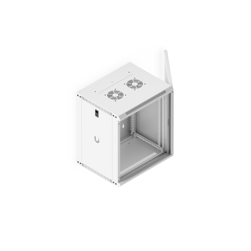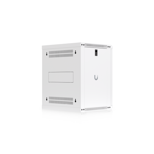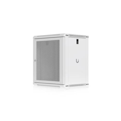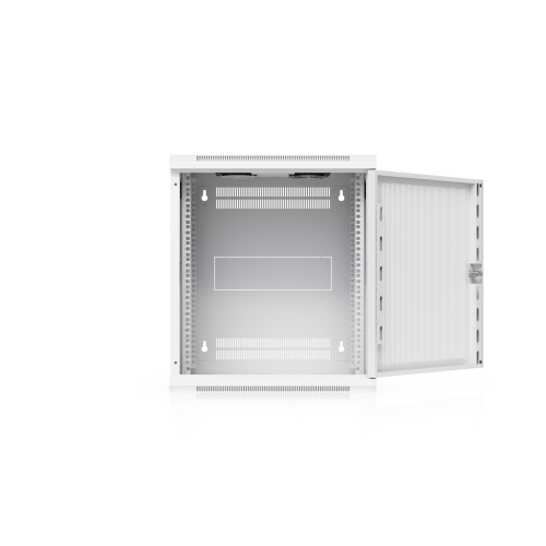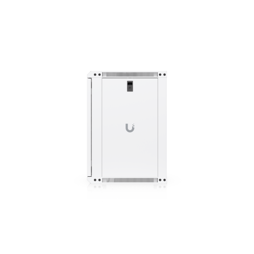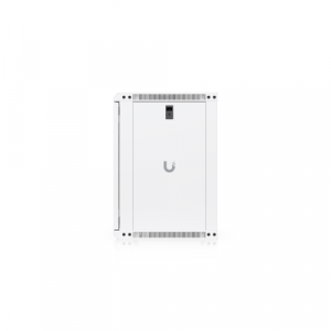 The door is factory-set to a left-hand orientation with the option to reverse it. With a depth of 450mm, the rack allows the installation of networking devices up to 325mm deep. To ensure efficient cooling of active components, the rack is equipped with a pair of fans, keeping total noise levels below 50dB(A). If you need to back up active devices using, for example, batteries, you will appreciate its above-standard load capacity of 50kg. The enclosure features an elegant white finish with a powder-coated surface, and the Ubiquiti logo is present on the side panels. Cable entry points covered with blanking plates are available on the bottom, top, and rear sides of the rack. Package Contents: 19″ Rack, 2x Keys, 4x Screws with metal wall plugs, Drilling template.