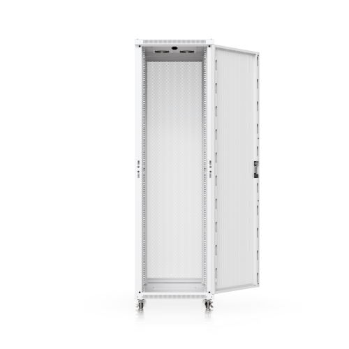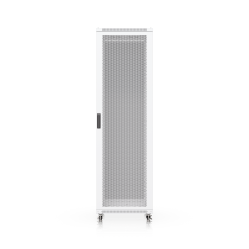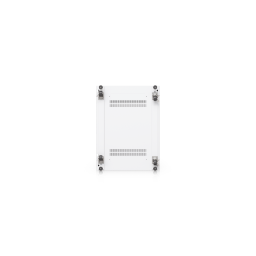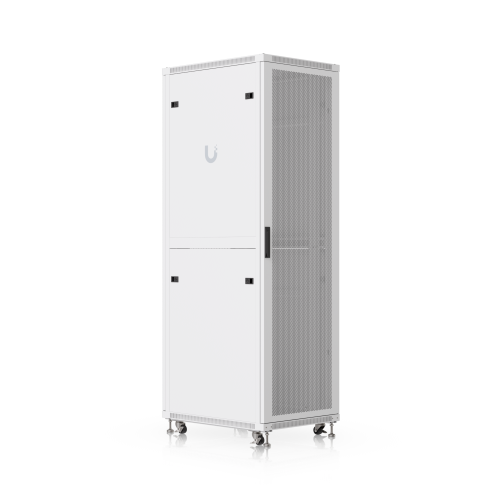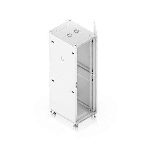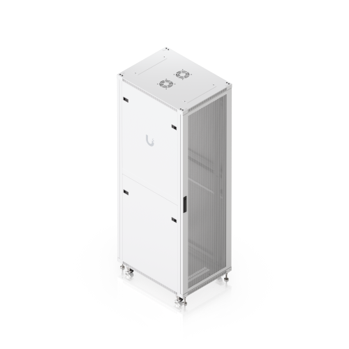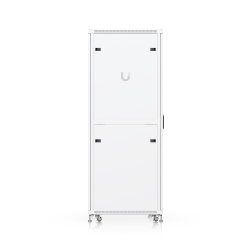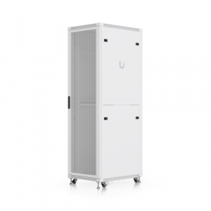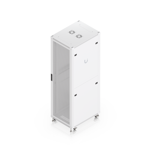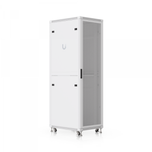 The door is factory-set to a left-hand orientation with the option to reverse it. With a depth of 800mm, the rack allows the installation of networking devices up to 682mm deep. The rack offers all the features you would expect from similar products, including front and rear opening doors, the option to anchor the rack to the floor or connect multiple racks together, leveling stands, lockable casters, and vertical cable management. To ensure efficient cooling of active components, the rack is equipped with four fans. The static load capacity is 800kg, and the rolling load capacity is up to 320kg. The enclosure features an elegant white finish with a powder-coated surface, and the Ubiquiti logo is present on the side panels. Cable entry points covered with blanking plates are available on the bottom, top, and rear sides of the rack. Package Contents: 19″ Rack, 3x Keys.