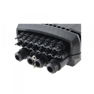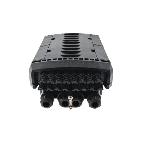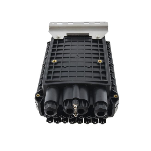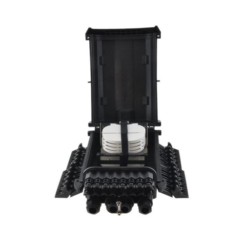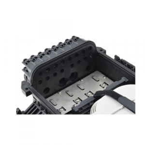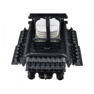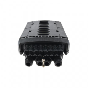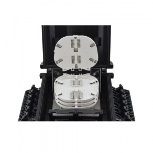Fiber optic splice enclosure has 4 entrance ports for magistral cables, and 16 out ports for client cables. Splice closure is dedicated for pole or wall mounting. Thanks to IP67 rating and high quality the product is ideal for aerial, ground and duct installations. The closure has 4 splice trays, each with capacity 24 splices and space for mounting 24 SC simplex or LC duplex adapters. The casing is made of high quality plastic material resistant to UV radiation, low (-40°C) and high (+60°C) temperatures, as well as chemicals.