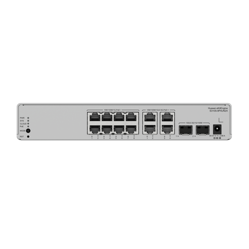 Huawei S310S-8P4UN2X is a reliable managed cloud L2+ PoE switch with a switching capacity of 76Gbps, 8x Gbit PoE+ ports, 4x 2.5G PoE++ ports and 2x SFP+ slots. It supports management via a local web interface as well as cloud management (eKit SNC / eKit mobile app). The maximum power consumption is 20.8W (without PoE load).