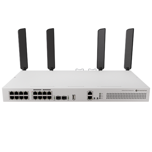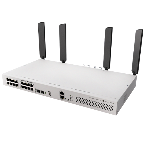 The Wi-Fi version of CRS418… with our strongest 4×4 MIMO Wi-Fi 6! L3 HW offloading, quad-core 2.2GHz ARM CPU, 16x Gigabit Ethernet ports + a Gigabit management port with a direct CPU line, 2x 10G SFP+ ports, PoE-out. Why settle for just a simple switch when you can have PoE-out, high-speed fiber uplinks, USB storage compatibility, advanced network control/monitoring, and enough processing power even for some routing or L3 HW offloading… in a single 1U device and for the best price on the market?