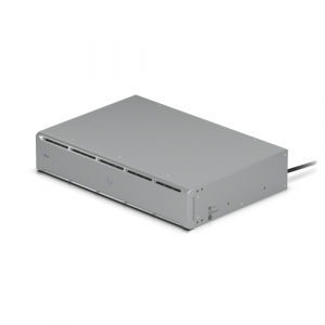 Continuous power is ensured by a 2x hot-swap replaceable batteries, which allow battery replacement while the unit remains operational, without the need to power it down. This ensures that connected devices remain continuously powered even during maintenance or battery replacement. The device is equipped with a Power button and a Factory Reset button, and features LED indicator. LED indicator displays the status of the device itself and indicates the battery status. At full load, the backup power supply can power connected devices for approximately 2,3 minutes. At half load, the runtime extends to about 8 minutes. Charging the battery to 90% capacity takes approximately 6 to 8 hours. The UPS-2U unit connects to the network interface via a 10/100MbE port.